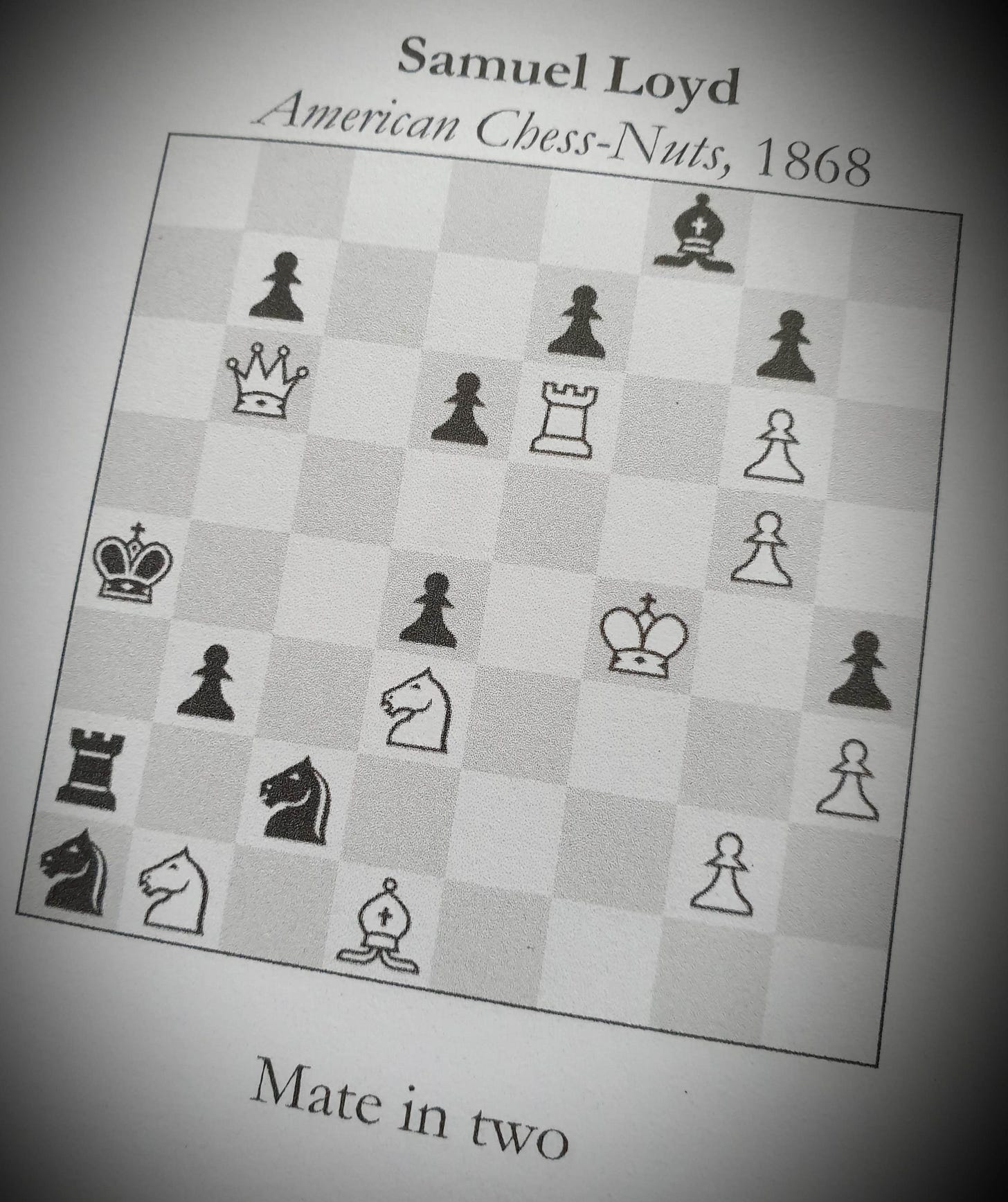 The page is turned down at a chess problem. Note that this is not a game, but a problem to solve.