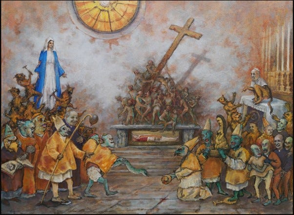 The painting resonates with a dark poignancy. Divided into three main areas of action alluding perhaps to the trinity, the triangle motif is then repeated, as if to draw attention to both Bergoglio’s political triangulation and the resulting slippage and disorientation of the trinity, now depicted as destabilized. Each portion in the painting depicts one of three factions in opposition with baying, animalistic and cruel faces, demonic expressions, alongside laughing figures who show no awareness that they are standing upon the symbols of faith, in both senses of the phrase. The various enemies of the church are welcomed and celebrated, and her faithful are set aside, unnoticed by the depicted clerical characters. Faith is represented in the form of Pope Pius X, the anti-modernist who lies in the background of the painting as a living witness rather than being encased in bronze. Above him dance the wriggling demons who drag down an unadorned cross whose shadow is cast ominously behind. The message is clear. Bergoglio’s triangulation is itself the perversion of the Trinitarian structure that has shored up the Church hitherto and is now being dismantled, one little piece at a time. I may be getting ahead of myself here, how do I know this was de Leastar’s intention? I do not. Bear with me.